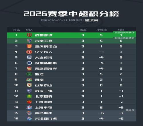 中超第3輪積分榜:西南F3繼續領跑,“上青天”三隊排名榜尾 懂球帝 2026-03-22 09:18:03 中超第3輪戰罷,成都蓉城在一場蕩氣回腸的川渝德比中3-3絕平銅梁龍,繼續積7分領跑。云南玉昆4-0完勝山東泰山,積6分升至第二,銅梁龍積5分排名第三。大連英博、遼寧鐵人、青島西海岸均取得賽季首勝,浙江隊客場4-1大勝青島海牛,成為負分中首支積分轉正的球隊,河南隊的積分也來到1分。上賽季中超前五名本輪均不勝,海港、泰山告負,蓉城戰平,京滬大戰平局收場,三鎮、國安、海港仍有機會在下輪抹掉負分。“上青天”三隊齊聚榜尾,申花3輪不敗搶到5分,積分仍為-5,海牛三連敗積分-7,津門虎1平2負0進球積分-9。下輪比賽,津門虎將與申花直接上演搶分大戰。中超免費觀看_申花免費觀看_梁龍免費觀看_中超高清在線_申花高清在線_梁龍高清在線 中超 申花 梁龍 津門虎 西南f3 上一篇: 【中超】奧斯卡雙響謝文能染紅玉昆4比0泰山 下一篇: 集體翻車,上賽季中超前五名本輪全部不勝