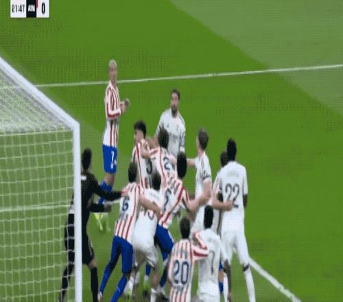 第21分鐘,皇馬開出角球,維尼修斯的近距離鏟射被小西蒙尼門線解圍,之后的補射也被小西蒙尼擋出。