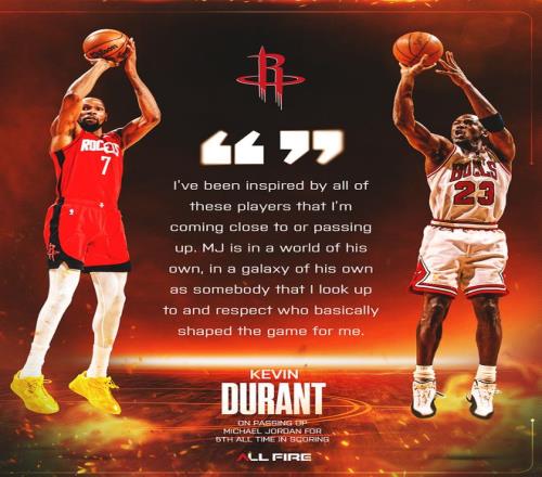 杜蘭特在采訪中談到自己打破喬丹的得分紀錄,他表示:無論誰超過喬丹的數據,可MJ的影響力不可撼動。MJ不是得分榜第一可他影響力太大了,他的每一項都是歷史性的,能在得分上接近他已經是一種榮譽。