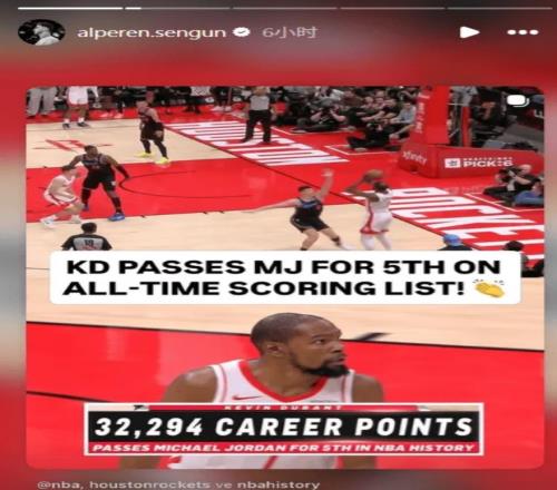 申京在杜蘭特完成32294分超越喬丹后,申京在賽后專門在IG上轉發這條推文來為KD慶祝。