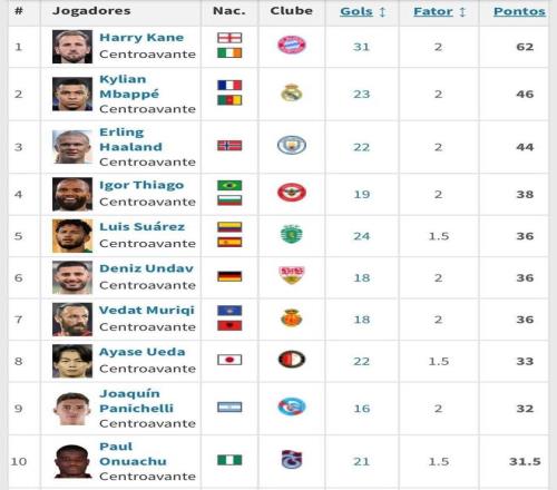 北京時間3月23日,德轉(zhuǎn)列出了目前歐洲金靴獎排名前10的球員,哈里-凱恩以31球排名第一,姆巴佩23球第二,哈蘭德22球第三,目前效力于費耶諾德的日本前鋒上田綺世上榜。