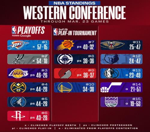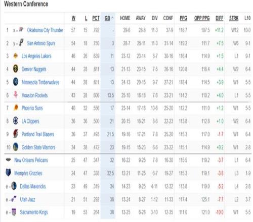 北京時間3月24日,NBA常規賽打完,西部的排名又有了微弱的變化,休斯頓火箭隊從第四直落第六,馬刺大勝熱火拿到6連勝后已經提前鎖定西南賽區的冠軍;湖人雖然惜敗活塞但因為此前的9連勝依舊穩居第三,快船狂勝雄鹿拿到二連勝繼續排第八壓制開拓者。