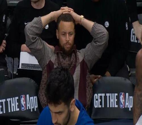 轉播方不敢再給特寫,信號直接切走,場邊庫里雙手抱頭,眉頭緊鎖,面色鐵青,戴上了痛苦面具。