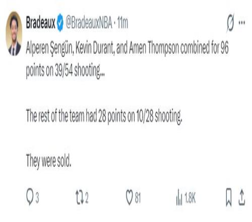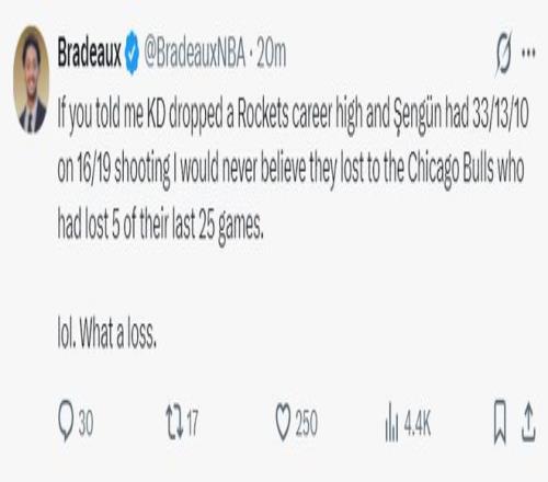休媒談到這場(chǎng)比賽的失利:杜蘭特40分火箭生涯最高分,申京19中16拿到33+13+10,我真的不敢相信輸給公牛這種球隊(duì) ,他們過去25場(chǎng)只贏了5場(chǎng)吧。