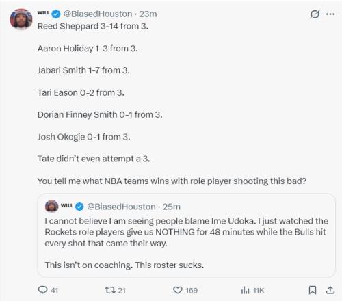 休媒:我不敢相信這場(chǎng)失利還有人噴烏度卡,我只看到火箭角色球員在48分鐘里毫無(wú)作為,而公牛可以命中他們接到的球。這與教練無(wú)關(guān),這輪換太糟糕了,泰特甚至都不敢出手三分,你告訴我哪支球隊(duì)的角色球員這樣的比賽能獲勝?