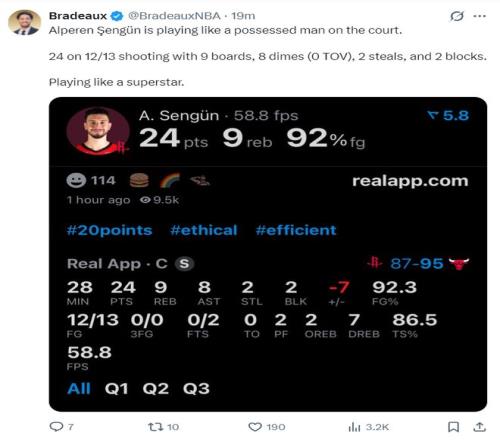 第三節(jié)申京更是單節(jié)6中6拿到12分6助攻5籃板,休媒:申京此役在球場上所向披靡,他想要什么就有什么。看到他接連打出多場高效的比賽真是太好了。火箭隊在一度落后22分的情況下他一人扛著球隊,申京正在烹飪公牛!