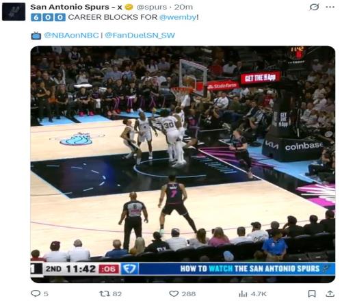 第二節開場文班亞馬就完成了生涯第600個封蓋,他協防端送出護筐,這就是外星人的能力,首節2分3籃板1蓋帽,第二節完成第一個蓋帽后達成600+封蓋里程碑。