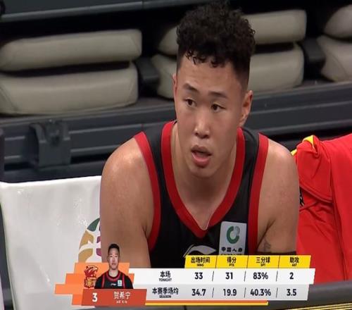 賽季至今賀希寧30場常規賽全勤,場均可以貢獻20.3分5.2個籃板3.4次助攻1.2次搶斷,投籃命中率47.5%,場均命中3.1記三分球,命中率高達41.4%,得分為生涯新高,本土球員中僅次于場均多0.5分的郭昊文排名本土球員第2位,但是對比球隊戰績和作用,賀希寧是當之無愧的球隊核心。