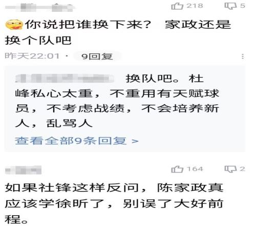 杜鋒的這番話,也讓廣東球迷的評(píng)論區(qū)炸鍋了,賽后不少廣東球迷質(zhì)問杜鋒:當(dāng)然是發(fā)揮不好的球員啊;演都不演了,原來廣東陣容這么牛,一個(gè)單節(jié)20分的20歲新星,竟然連上場(chǎng)機(jī)會(huì)都不值得擁有?家政還是換個(gè)隊(duì)吧,真該學(xué)徐昕了,別誤了大好前程。