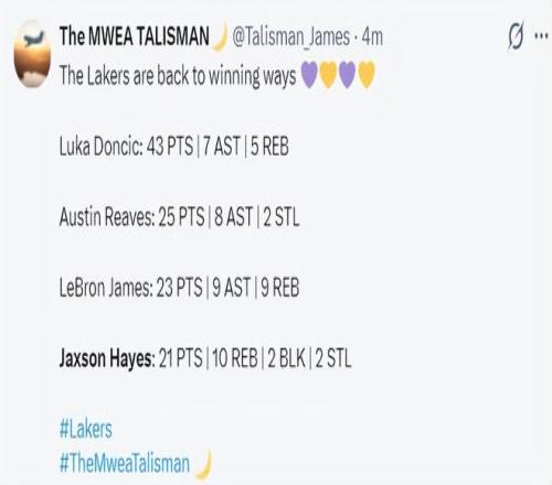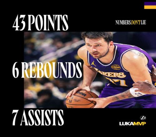 這場比賽東契奇43分7助攻6籃板,里夫斯25分8助攻,詹姆斯23分9籃板9助攻,海斯21分10籃板,只有海斯一人完成了20+10的數據。