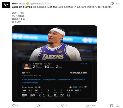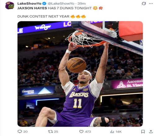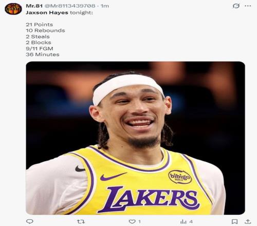 根據湖人媒體Lake Show Yo的統計這場比賽海斯足足扣籃7次,他9個運動戰進球全部來自于三秒區內,他比艾頓更喜歡打擋拆順下的戰術,里夫斯、東契奇、詹姆斯三人都為他送出了空中接力的助攻。