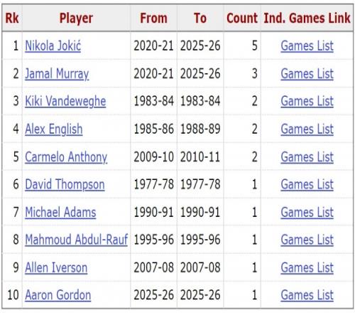 隊史最佳二人組約基奇和穆雷目前是掘金隊史50場次榜前二 Twitter 2026-03-26 20:45:30 體育播報3月26日宣 NBA常規賽,掘金主場142-135戰勝獨行俠。穆雷出戰41分16秒,28中19,三分14中9,罰球6中6,得到53分6籃板4助攻。這是他職業生涯第4個50+。在掘金隊史50+場次排行榜上,約基奇目前以5次50+排名第一,穆雷以4次50+排名第二。籃球免費觀看_NBA免費觀看_掘金免費觀看_籃球高清在線_NBA高清在線_掘金高清在線 籃球 NBA 掘金 約基奇 上一篇: 有趣的靈魂!約基奇穿小黃人洞洞鞋接受采訪此前cos該電影角色 下一篇: 虐菜很穩!本賽季面對勝率50%以下球隊勝場雷霆第一湖人第二