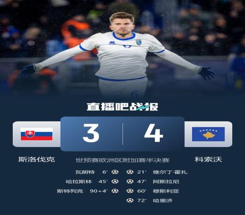 體育播報3月27日宣 北京時間3月27日凌晨3時45分,世預賽歐洲區附加賽半決賽在特赫爾內波勒球場展開角逐,斯洛伐克主場迎戰科索沃。上半場瓦朗特先拔頭籌,哈拉斯林傳射+中柱,霍扎扳平,下半場阿斯拉尼頭球追平,沃伊沃達兩助攻,穆斯利亞任意球反超,哈里濟補射破門,斯特列克補時扳回一城。最終科索沃客場4-3逆轉斯洛伐克晉級附加賽決賽,決賽將對陣土耳其。