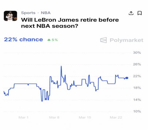 結束傳奇生涯數據媒體:詹姆斯今夏退役的概率為22% Twitter 2026-03-27 07:51:08 體育播報3月26日宣 近日數據媒體Polymarket在社媒曬出了今夏詹姆斯退役的概率,為22%。本賽季至今,詹姆斯出戰了52場比賽,場均可貢獻21分6板6.9助1.1斷,投籃命中率51.3%,三分命中率31.5%。 籃球免費觀看_NBA免費觀看_湖人免費觀看_籃球高清在線_NBA高清在線_湖人高清在線 籃球 NBA 湖人 詹姆斯 上一篇: 杜蘭特:百分百在乎自己的歷史地位和表現&希望被后人銘記 下一篇: 弗拉格:我們防守穆雷做得不算差但他手感太火熱了