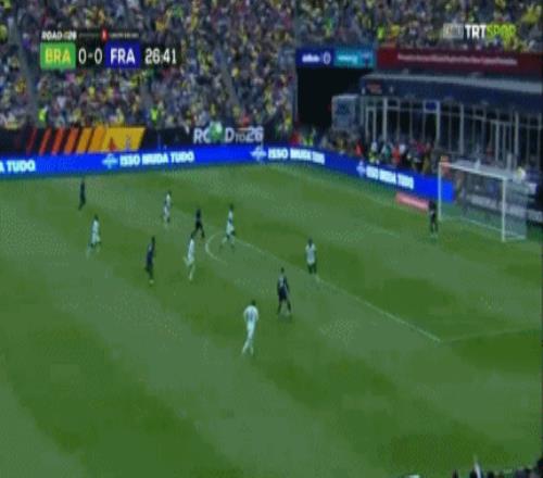 易邊再戰,第54分鐘,于帕梅卡諾禁區邊放倒韋斯利,裁判觀看VAR后直紅罰下,法國隊剩余時間不得不少1人。