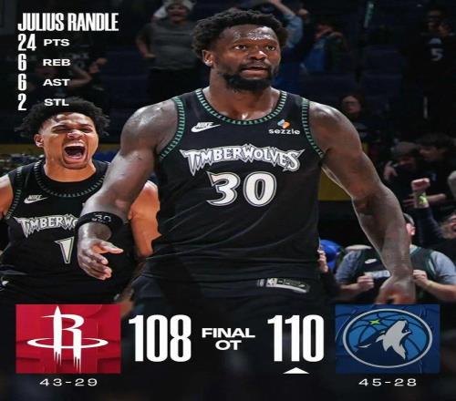 本場比賽加時賽,火箭開局13-0,隨后森林狼打出一波15-0完成逆轉,創NBA歷史加時最大分差逆轉!