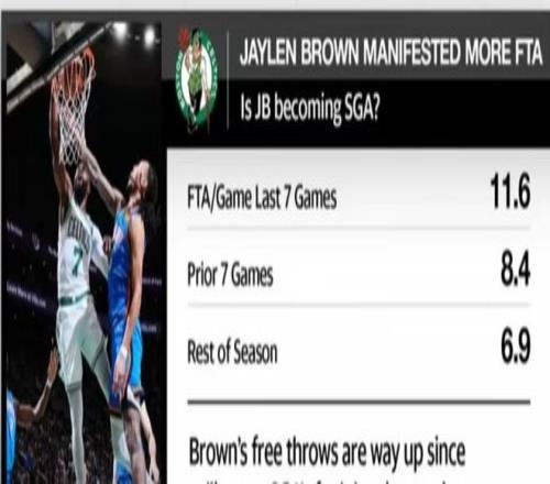 3月13日那場,凱爾特人輸了2分。布朗18投7中,罰球7中6,20分。賽后他怒噴亞歷山大“不是籃球”。之后7場,他罰了81個球,場均11.6次,球隊5勝2負。他用自己的方式回應了那場失利,也用自己的方式打了自己的臉。