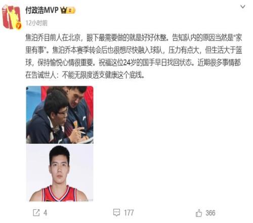 賽前媒體人付政浩也寫了一篇關于焦泊喬缺席比賽的報道,文章中沒有指名道姓,只是說焦泊喬最近壓力有點大,但生活大于籃球,保持愉悅心情很重要,近期很多事情都在告誡世人:不能無限度透支健康這個底線。