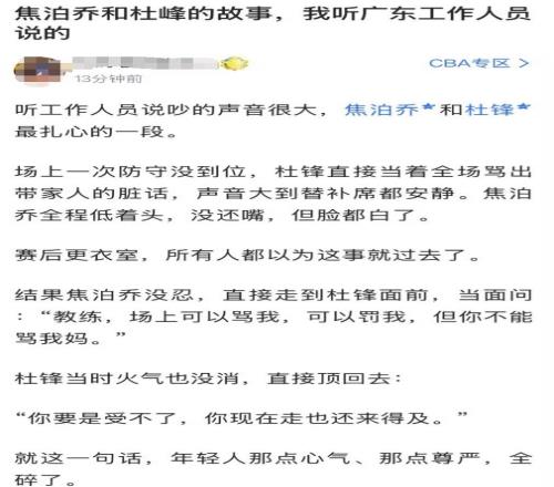 賽后廣東球迷評論區,有“知情人”還從廣東隊工作人員那里打聽到其中內幕,焦泊喬之所以離隊,主要是和杜鋒鬧了矛盾,之前比賽場上有一次防守沒到位,杜鋒直接當著全場罵焦泊喬,把焦泊喬都罵到臉都白了,賽后更衣室,所有人都以為這事就過去了,結果焦泊喬沒忍,直接走到杜鋒面前,當面質問杜鋒:“場上可以罵我,可以罰我,但你不能罵我媽。”(據說焦泊喬是在單親家庭長大的)