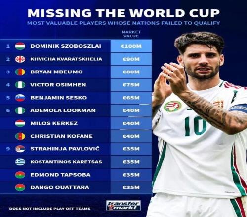 世歐預附加賽進入決賽階段,德轉官方統(tǒng)計無緣今夏世界杯身價最高的球員。匈牙利當家球星、利物浦中場索博斯洛伊以1億歐領銜。