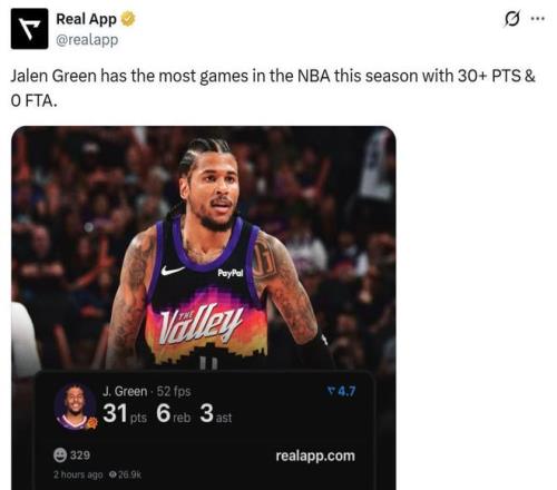 這是本賽季杰倫格林第二次0罰情況下砍下30+得分表現,高居聯盟第一,其余人最多做到過一次。