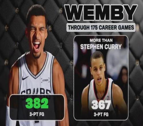 在三分球命中數(shù)方面,文班亞馬以382個(gè)超越了庫(kù)里的367個(gè)。