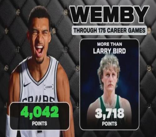 在得分方面,文班亞馬以4042分超越了拉里·伯德的3718分。