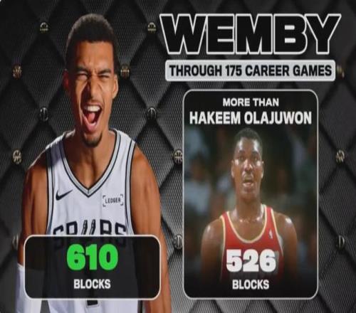 在封蓋方面,文班亞馬以610個(gè)超越了奧拉朱旺的526個(gè)。