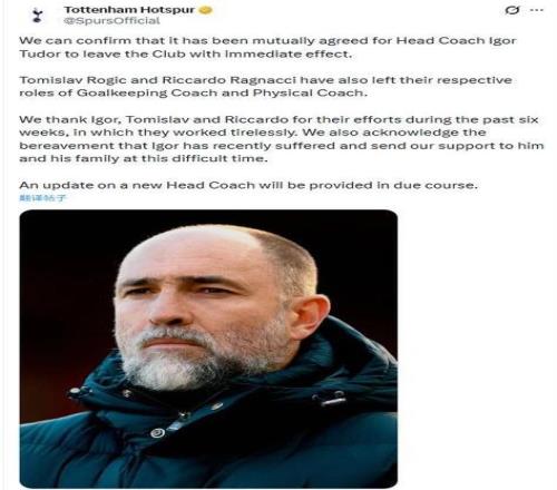 英超賽季進入最殘酷的沖刺階段,北倫敦卻突然爆出重磅消息,托特納姆熱刺正式宣布與主帥伊戈爾·圖多爾提前解約,隨著他下課,助理教練羅吉奇和體能教練拉尼亞奇也一同離隊。這位克羅地亞教頭的執教周期定格在短短44天,5場英超奪1分,歐冠出局;成為近年來英超最“短命”的主教練之一。