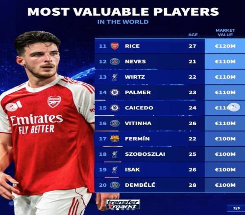 11. 賴斯(阿森納)1.2億歐元