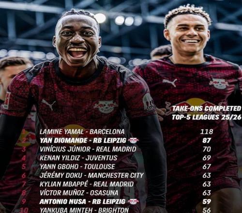 本賽季至今,揚迪奧曼德代表RB萊比錫出戰各項賽事29場,交出了11球7助攻的亮眼成績單。而真正讓整個歐洲為之側目的,是他令人嘆為觀止的突破能力。到目前為止,揚迪奧曼德的過人數據僅次于亞馬爾,是德甲賽場實至名歸的過人王。在本賽季五大聯賽成功過人次數榜單上,揚迪奧曼德以87次成功過人高居第二,僅次于巴薩天才亞馬爾的108次。但別忘了,亞馬爾早已是公認的頂級天賦,而這位萊比錫邊鋒,一年半前還在美國半職業聯賽掙扎。