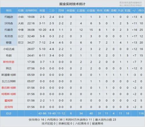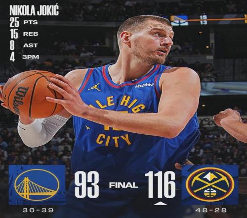 約基奇20投10中,三分8中4,罰球1中1,砍下25分15籃板8助攻1搶斷2失誤,正負(fù)值+16。第三節(jié)約老師獨(dú)得10分5籃板4助攻,率領(lǐng)掘金單節(jié)40-21帶走比賽。小哈達(dá)威投進(jìn)4記三分,拿到16分3籃板2助攻2搶斷,正負(fù)值+12。