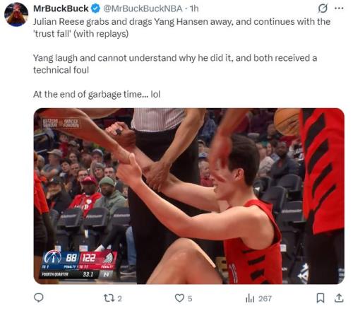 美媒也為楊瀚森抱不平:在比賽垃圾時間,朱利安-里斯從身后抓住楊瀚森將他拖走,然后進行了‘信任墜落’(抱摔),楊瀚森哈哈大笑不明白里斯為何這樣做,裁判在看了回放的情況下給了兩人技術(shù)犯規(guī)。