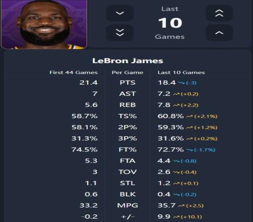 數據不會說謊,在詹姆斯傷愈復出的這10場比賽中,湖人取得了9勝1負的戰績,氣勢如虹。而老詹也是找到了一個很好的平衡點,當東契奇和里夫斯在場且狀態火熱時,他退居幕后、干好三當家的活,而當球隊需要他站出來時,暗中積蓄力量的他就會挺身而出、責無旁貸。這10場球,老詹場均貢獻18.4分7.8籃板7.2助攻1.2搶斷,乍一看場均得分有所下滑,但勝在更加全面,和賽季的前44場球相比,場均得分確實下降了3分,但命中率上漲了1.2個百分點,真實命中率提升2.1%,場均助攻上升0.2,場均籃板上升2.2個,個人正負值則是從-0.2飆升至9.9。一句話概括就是,詹姆斯打得更加高效也更加合理了,顯然他很適應新的定位、新的角色。