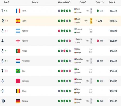 榜首易主!西班牙戰平埃及讓出FIFA世界第一,法國登頂 直播吧 2026-04-01 07:24:13 體育播報04月01日宣 FIFA國家隊即時世界排名更新,西班牙0-0戰平埃及,法國即時排名反超西班牙,升至世界第1位。法國3-1哥倫比亞獲得了3.36個積分,西班牙戰平埃及扣除2.73個積分。西班牙因此遭到法國反超,跌至世界第2位,排名歐洲區第2。歐足聯球隊 FIFA 實時排名↓1. 法國(1)2. 西班牙(2)3. 英格蘭(4)4. 葡萄牙(5)5. 荷蘭(6)6. 比利時(9)7. 德國(10)8. 克羅地亞(11)足球免費觀看_法國免費觀看_西班牙免費觀看_足球高清在線_法國高清在線_西班牙高清在線 足球 法國 西班牙 埃及 國家隊 葡萄牙 英格蘭 荷蘭 比利時 德國 克羅地亞 五洲 葡超 荷甲 英超 西甲 意甲 德甲 法甲 上一篇: 時隔24年!土耳其10科索沃晉級世界杯正賽阿克蒂爾克奧盧制勝球 下一篇: 英超保級賠率:森林1賠1.11、熱刺1賠1.5、西漢姆聯1賠1.66
