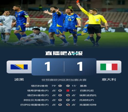 體育播報(bào)4月1日宣 北京時(shí)間2:45,世預(yù)賽歐洲區(qū)附加賽決賽波黑vs意大利,比賽在比利諾波耶球場(chǎng)打響!上半場(chǎng),波黑門將送大禮,巴雷拉助攻基恩破門!多納魯馬多次撲救;巴斯托尼最后一人犯規(guī)染紅!下半場(chǎng),基恩錯(cuò)失單刀良機(jī)!塔巴科維奇補(bǔ)射扳平!90分鐘結(jié)束,十人意大利1-1波黑,加時(shí)賽雙方均無建樹,兩隊(duì)進(jìn)入殘酷的點(diǎn)球大戰(zhàn)!點(diǎn)球大戰(zhàn)中,埃斯波西托、克里斯坦特失點(diǎn)!最終,意大利1-1點(diǎn)球大戰(zhàn)1-4不敵波黑,連續(xù)三屆無緣世界杯!