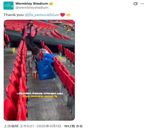 溫布利球場官方社媒致謝日本球迷清理垃圾:謝謝你們 Twitter 2026-04-01 16:24:09 體育播報04月01日宣 友誼賽,日本1-0力克英格蘭,隊史首次擊敗對手。賽后溫布利球場官方曬出視頻,致謝日本球迷清理球場的垃圾。足球免費(fèi)觀看_日本免費(fèi)觀看_國家隊免費(fèi)觀看_足球高清在線_日本高清在線_國家隊高清在線 足球 日本 國家隊 英格蘭 上一篇: 伊拉克球員:我們將勝利獻(xiàn)給伊拉克人民和球迷,夢想成真了 下一篇: 亞足聯(lián)主席祝賀各隊獲亞洲杯資格:亞洲足壇整體實力差距縮小