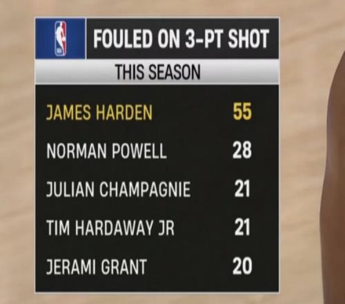 本賽季三分被犯規數:哈登55次獨一檔鮑威爾28次第二