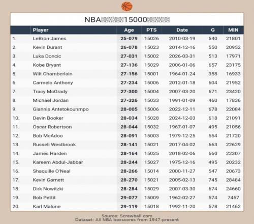 東契奇15000分歷史第3年輕!超科比!僅次詹姆斯杜蘭特! 直播吧 2026-04-01 17:59:31 體育播報04月01日宣 湖人主場戰騎士,第三節2分27秒,東契奇拿到本場第33分,達成個人職業生涯15000分。27歲31天的東契奇成為NBA歷史第三年輕達成15000分的球員,超越科比(27歲136天),僅次詹姆斯(25歲79天)、杜蘭特(26歲78天)。513場比賽就達成15000分的東契奇,也是達成15000分所用場數歷史第四少的,僅次張伯倫(358場)、喬丹(460場)、賈巴爾(495場)。 籃球免費觀看_NBA免費觀看_湖人免費觀看_籃球高清在線_NBA高清在線_湖人高清在線 籃球 NBA 湖人 東契奇 科比 杜蘭特 詹姆斯 火箭 上一篇: 活塞主場127116逆轉猛龍杜倫狂砍31分率隊下半場發力 下一篇: 騎士113127湖人4壞消息!防守成漏洞,莫布利與米切爾一塌糊涂!