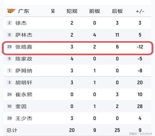 值得一提的是,本場比賽廣東隊的張浩嘉先抑后揚,在前3節進攻端0分情況下,末節迎來爆發。此役,張皓嘉出戰27分鐘,投籃8中4、三分6中2得到10分8籃板,另有2助攻2蓋帽進賬,由于張皓嘉前3節表現平平,所以盡量他末節獨取10分,但場上正負值為-12,仍排在全隊倒數第一。而張浩嘉此役得到10分,也是本賽季首次得分上雙……