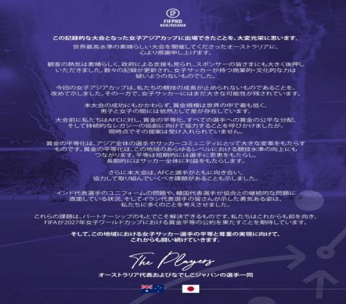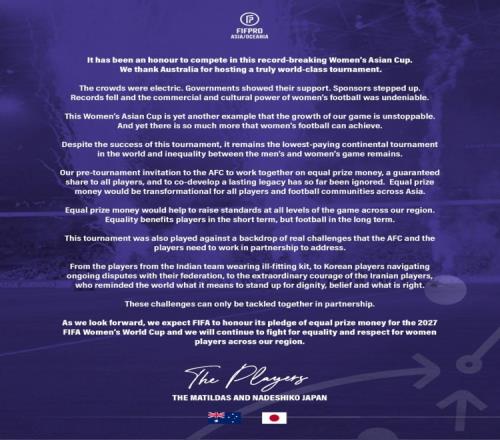 今日,F(xiàn)IFPRO(國際職業(yè)足球運(yùn)動(dòng)員聯(lián)合會(huì))官推更新,曬出了澳大利亞女足和日本女足要求提高獎(jiǎng)金的共同聲明。聲明內(nèi)容如下: