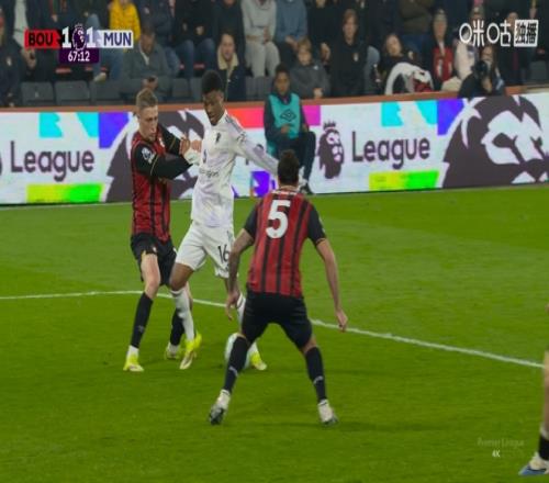 比賽的第67分鐘,阿瑪?shù)陆麉^(qū)與特呂費(fèi)爾對抗后倒地,裁判沒有表示,VAR維持判罰。隨后伯恩茅斯就地反擊將比分扳平。