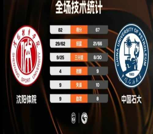 末節爭奪,姜相杰三分將優勢再度擴大到兩位數,此后雙方圍繞10分分差展開拉鋸戰,韓俊龍連續內線得手,宋烽巖再中三分,劉相東連投帶罰還以顏色,沈陽體院穩扎穩打保持場上主動,中國石大苦苦追趕無果。最終,沈陽體院82-67力克中國石大。