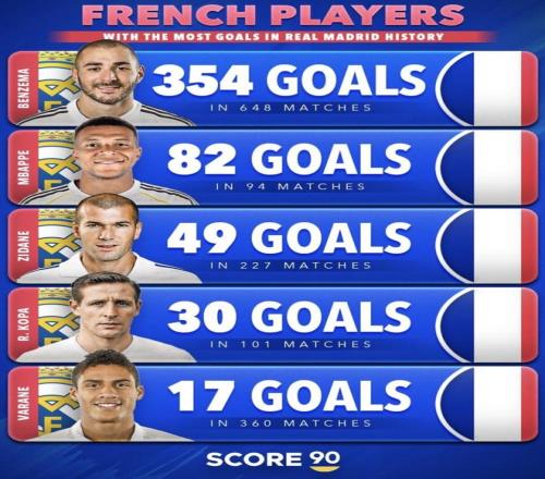 齊達內雖然只有49個進球,但誰敢說他分量不夠?227場比賽、歐冠制勝天外飛仙、西甲冠軍,再加上他身上自帶的世界杯和金球獎光環,決定了他在這份名單里有著無可替代的地位。再看后場,瓦拉內360場17球,10個賽季刷走18冠,把法國隊的防線牌面也撐住了。