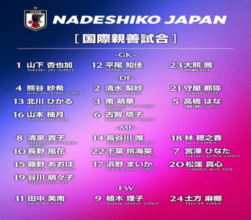 7-宮澤日向(曼聯)8-清家貴子(布萊頓)10-長野風花(利物浦)14-長谷川唯(曼城)15-藤野青葉(曼城)17-浜野舞香(熱刺)18-林穗之香(埃弗頓)19-谷川萌萌子(拜仁慕尼黑)20-松洼真心(北卡羅來納勇氣)22-千葉玲海菜(法蘭克福)
