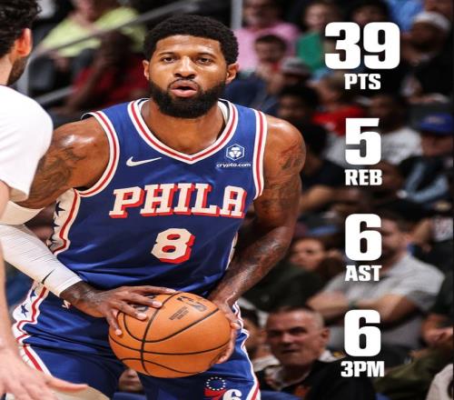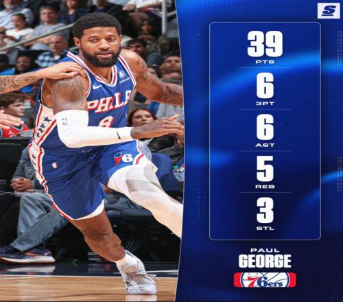 馬克西此役34分鐘拿到28分9助攻1搶斷,埃奇庫姆33分鐘23分10助攻,而喬治30分鐘,22中15,三分12中6,罰球4中3,拿到39分6助攻5籃板3搶斷0失誤,命中率68.2%,三分命中率50%,真實命中率82.1%,正負值+26。