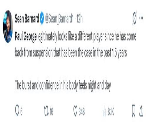 費城記者Sean Barnard寫道:喬治回歸賽場后確實展現出完全不同的風采,過去一年半他多次傷停/禁賽。他回歸后身體的爆發力與自信心簡直天壤之別。