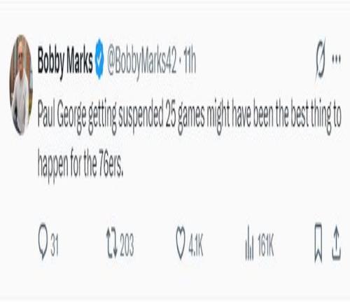 ESPN記者鮑比-馬克斯寫道:保羅-喬治被禁賽25場,可能反而是76人發生的最好的一件事。