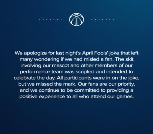 體育播報04月03日宣 奇才官方今日發布聲明,表示為愚人節惡作劇向球迷道歉。