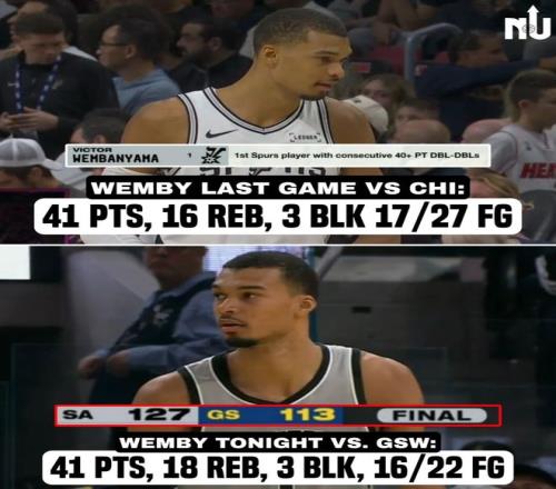 ——41分追平了文班亞馬生涯第四高分